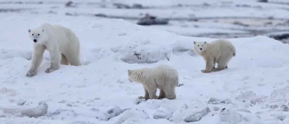 编号X33991的北极熊姆妈,正参与加拿大环境与花式变化部(Environment and Climate Change Canada)和阿尔伯塔大学(University of Alberta)合营开展的一项考虑技俩。该技俩通过为成年雌性北极熊辅导GPS跟踪项圈,监测它们在海冰上的当作,以更好地了解和保护这一濒危物种。上个月,考虑东说念主员在加拿大败部冰天雪地的田园中,用镜头记载下了这只姆妈和两只简陋10到11个月大的幼崽踉跄前行的画面。视频中,一只幼崽似乎落在了背面,而北极熊姆妈和另一只幼崽则停驻脚步,耐烦性恭候着它。当小家伙磕趔趄绊地跑向它们时,那份卓绝血统的亲情坚毅令东说念主动容。