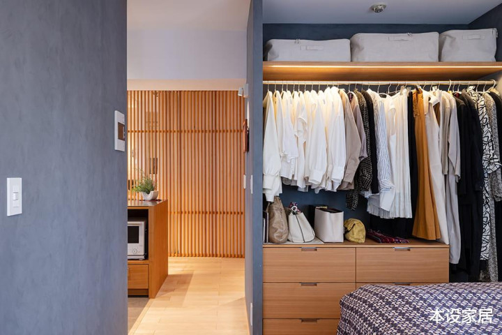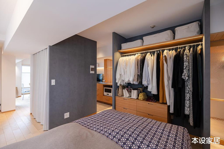 从细节不错看出,她十分善于分类,把非当季的衣着纳入收纳箱置于上部,而当季和常穿的衣着则吊挂起来,一目了然,存取浅易。