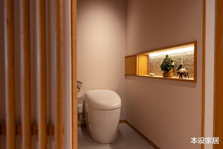 卫生间围聚玄关,外围接受实木条作念隐敝,透光、透气,又不完全透视野。