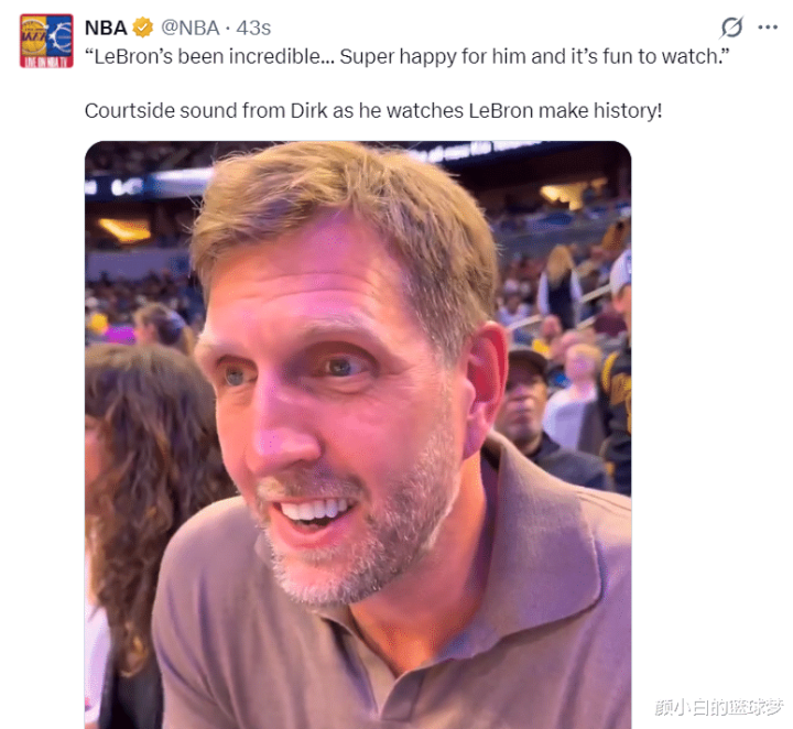 名宿诺维茨基此役到场不雅战,他谈到勒布朗加冕历史出场王:詹姆斯果然太弗成念念议了,为他感到超等兴盛,看他打球也很意旨。