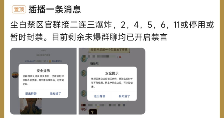 荒芜是近期,玩家发现更诡异的事情发生了,《尘白禁区》多个官方QQ群接二连三“爆炸”,有网友线路,其2、4、5、6、11群或停用或暂时封禁,其他群也被官方开启一齐禁言。
