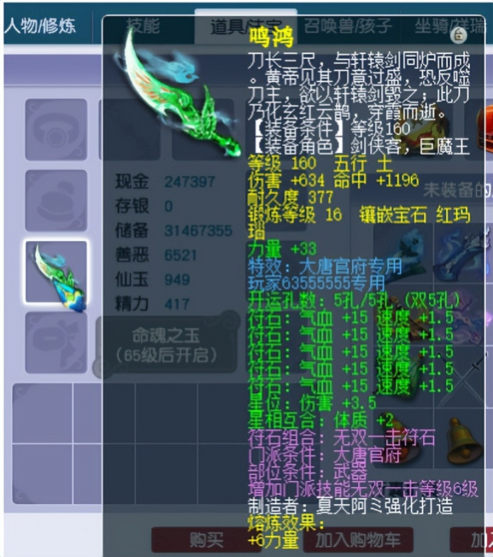 这个价值百万的大唐号上所带的160级的专用兵器,仔细一看真的是服战级别的,因为它的基础伤害就有着634点,在打上16级的玛瑙石后,掷中是到了1196点,同期鄙人排的附带属性上有着33点的力量加成。