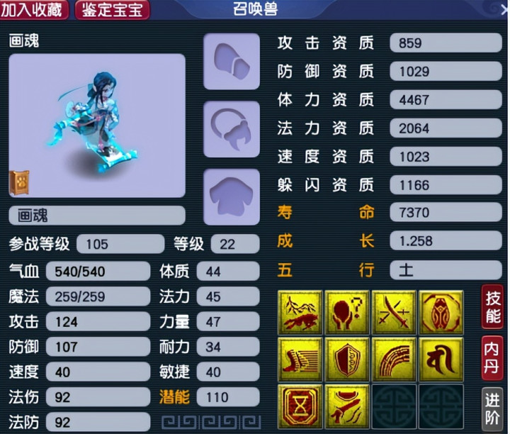这只画魂召唤兽在时代上有着10个,其中还含有一个寥落时代净台妙谛,而在兽诀的搭配上玩家选的是能为召唤兽带来更多物理抗性的高等驻防、高等违反、高等红运。