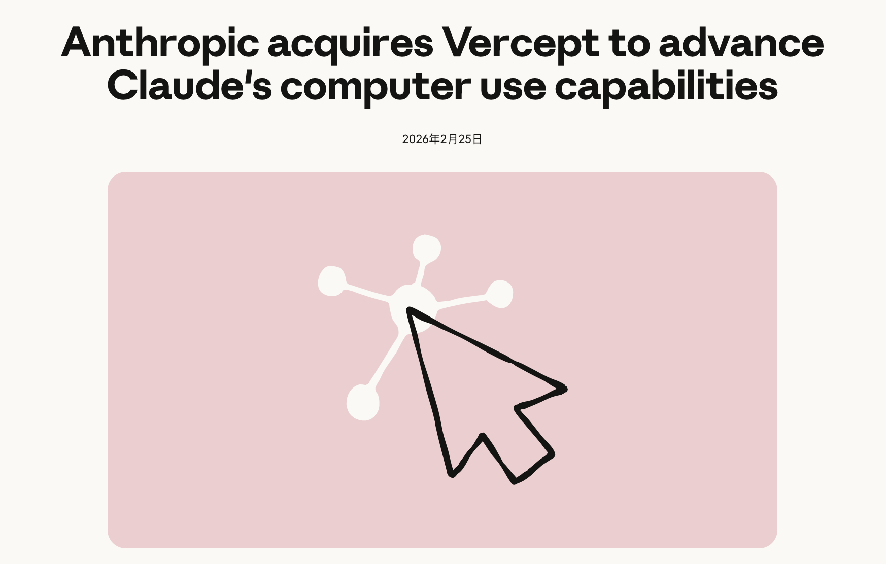 {jz:field.toptypename/}北京时辰2月26日,好意思国AI头部公司Anthropic晓谕收购视觉驱动蓄意机自动化AI初创公司Vercept ,补全Computer Use功能的视觉短板。这是继2025年12月收购全栈用具链初创公司Bun后,Anthropic第二笔收购案。