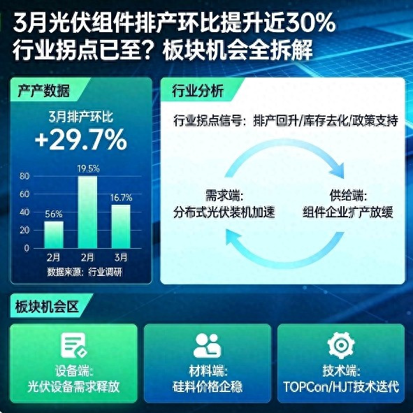 最新光伏行业排产数据出炉,3月组件排产环比大幅素质近30%,创下近期新高,这一数据骤然燃烧商场阐扬。好多投资者齐在问,光伏组件排产大幅增长意味着什么?是行业需求迎来爆发,照旧产能膨胀的虚火?联结最新行业动态、订单落地情况与资金流向,深远拆解光伏板块现时的中枢逻辑与后续契机。