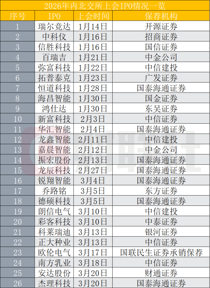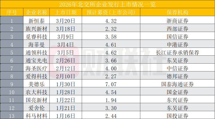 2026年以来,当今北交所已有13家企业告成刊行上市,其中最新挂牌的是由浙商证券保荐的新恒泰。