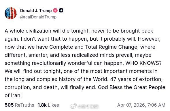 据新华社,好意思国总统特朗普7日在酬酢媒体上发文恫吓伊朗称,“今晚,所有这个词这个词好意思丽将死灭”。