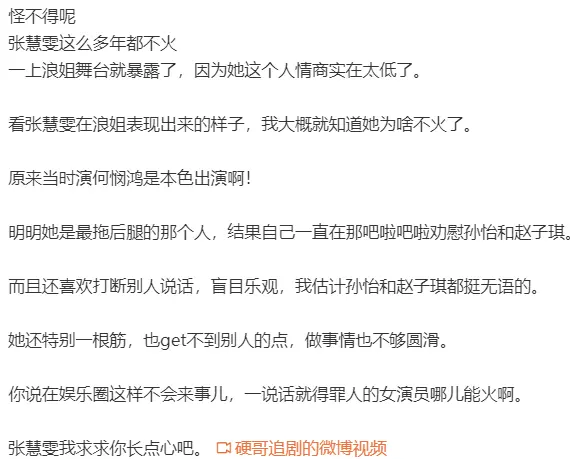 甚而还有说,张慧雯就蛮何悯鸿的。拿戏里糟心变装,隐射本东说念主,依然算是一种很严酷的责骂。