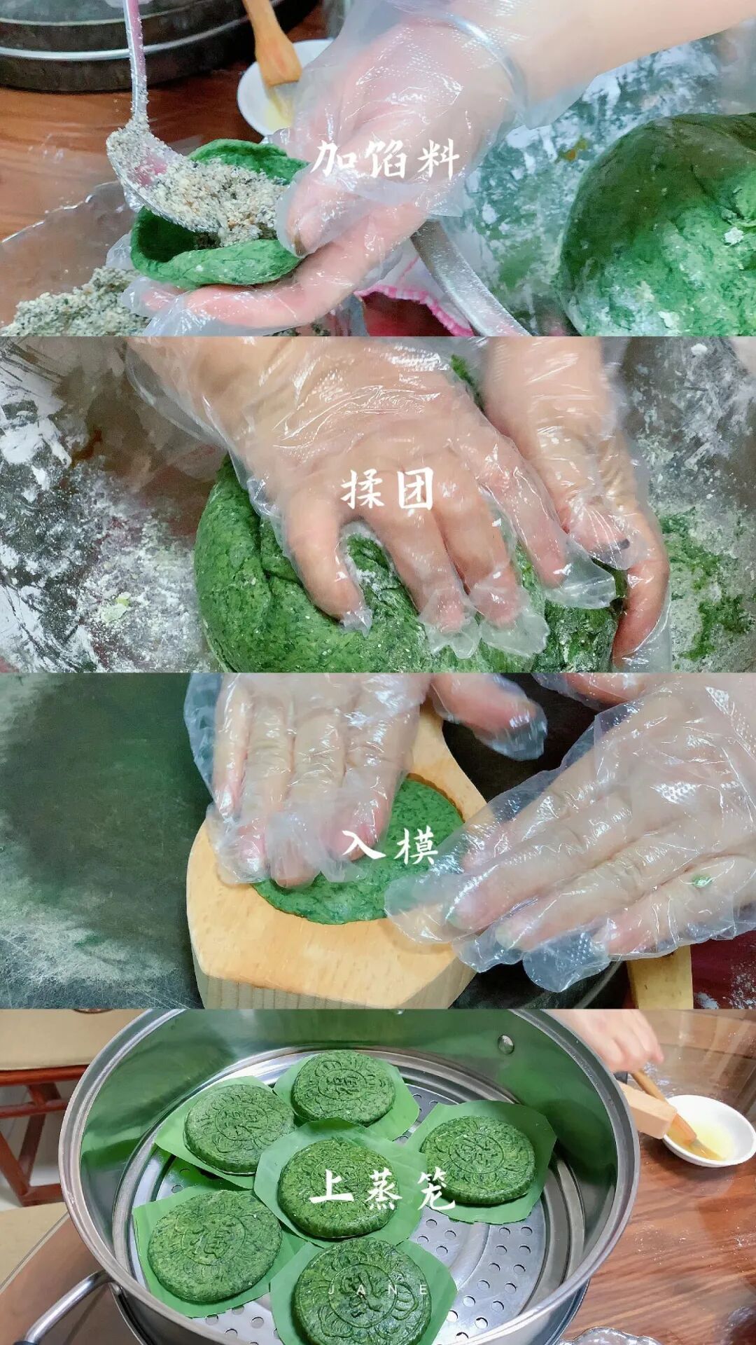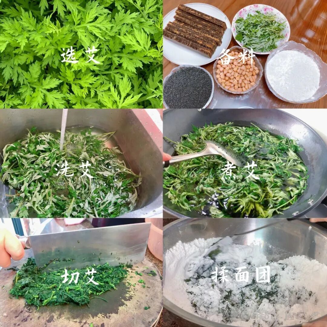 选艾、揉面、加料、入模、上蒸笼,