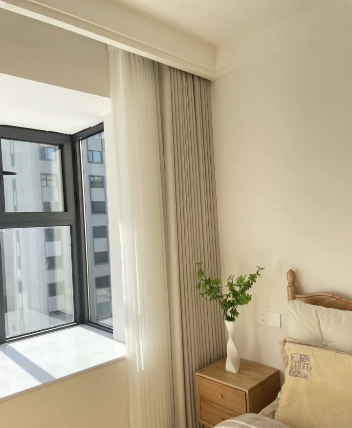 要是你的房间空间比拟宽广,又念念要空间既排场又实用的话,我保举一个“靠墙+靠窗”装的组合,把布帘挂在飘窗旁的墙壁上,然后在飘窗上装一层漂荡的纱帘。