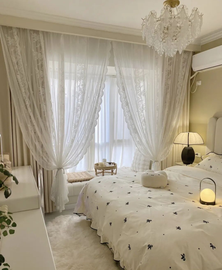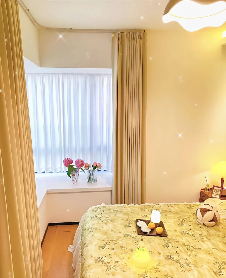 将窗帘围聚窗户装配,可以让飘窗的深度展现出来,给卧室带来更好的线索感,让空间显得更立体,“进深”成果比拟强。