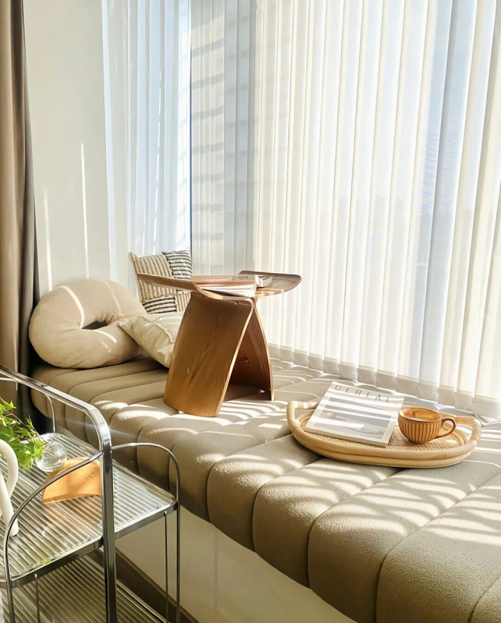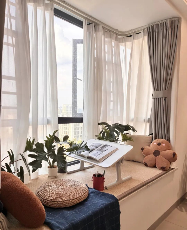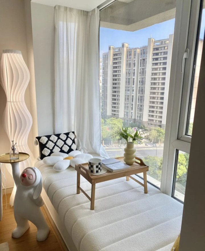 要是你的房间有飘窗的话,也别忘了搭配一个飘窗垫。这么在失业时,可以坐下来喝茶、看书,享受那份宁静与和睦。