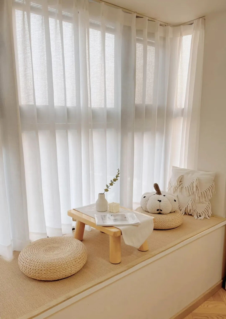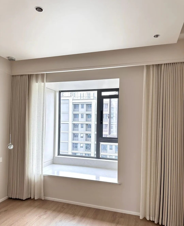 关于那些房间面积有限的小伙伴们来说,把窗帘挂在飘窗上,能让空间看起来愈加开朗,不会让东谈主有“挤迫”感。