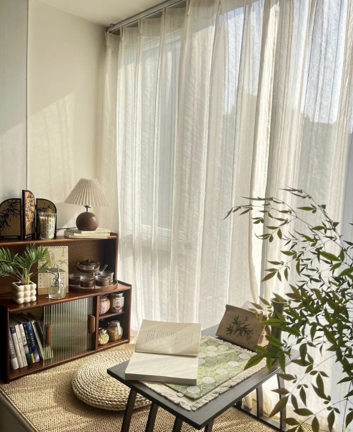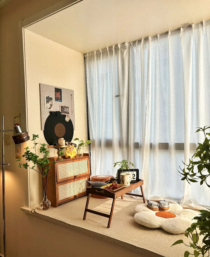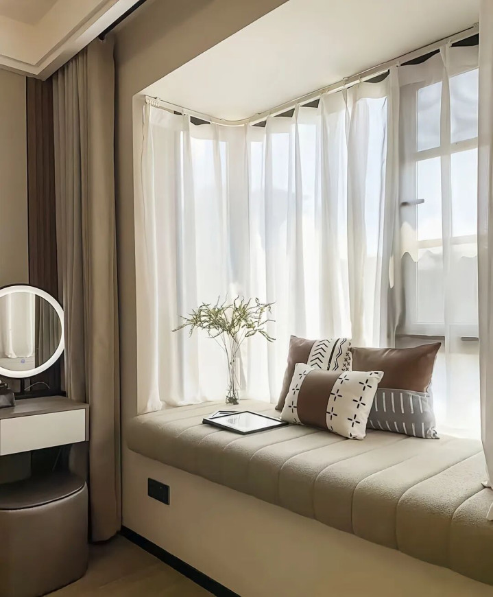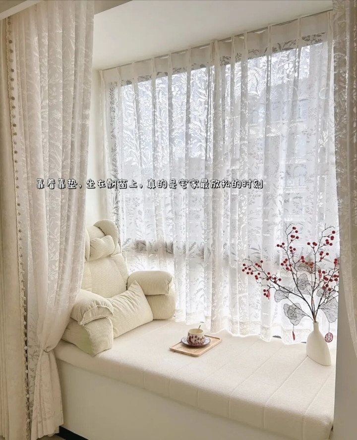 念念让你的房间短暂“变大”,可以辩论把窗帘和纱帘王人装配在飘窗地方的墙面上,最佳围聚飘窗的顶部装,帘子或者逃避总计这个词墙面成果更好。这么一来,卧室就能短暂教训气场,营造出一种宽广而陶然的嗅觉。
