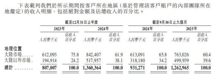 其中,重要的一组数据是区域各别。2023年,大陆之外商场收入占比为24.2%,到2024年升到38.1%,结尾2025年9月30日止九个月为39.6%。