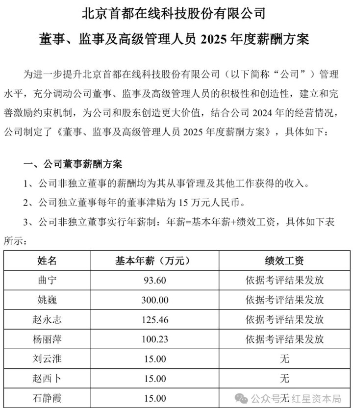 都门在线2025年4月1日发布的《董事、监事及高档惩处东谈主员2025年度薪酬决议》