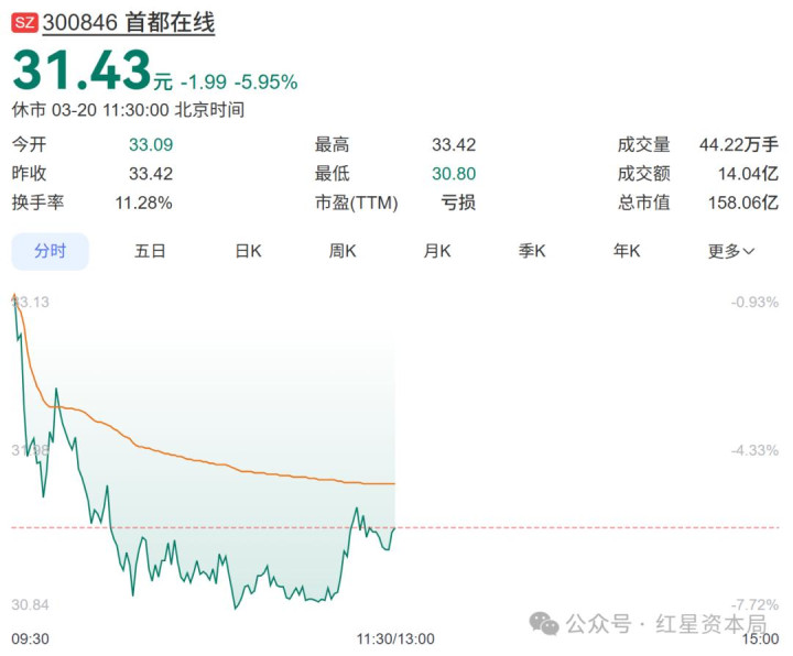3月20日,都门在线股价低开低走,限制午间收盘报31.43元/股,跌5.95%,市值158.06亿元。