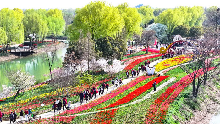 3月27日,泗洪洪泽湖湿地景区内郁金香竞相怒放,期许勃勃,引诱广阔旅客前来踏青赏花,乐享好意思好春光。