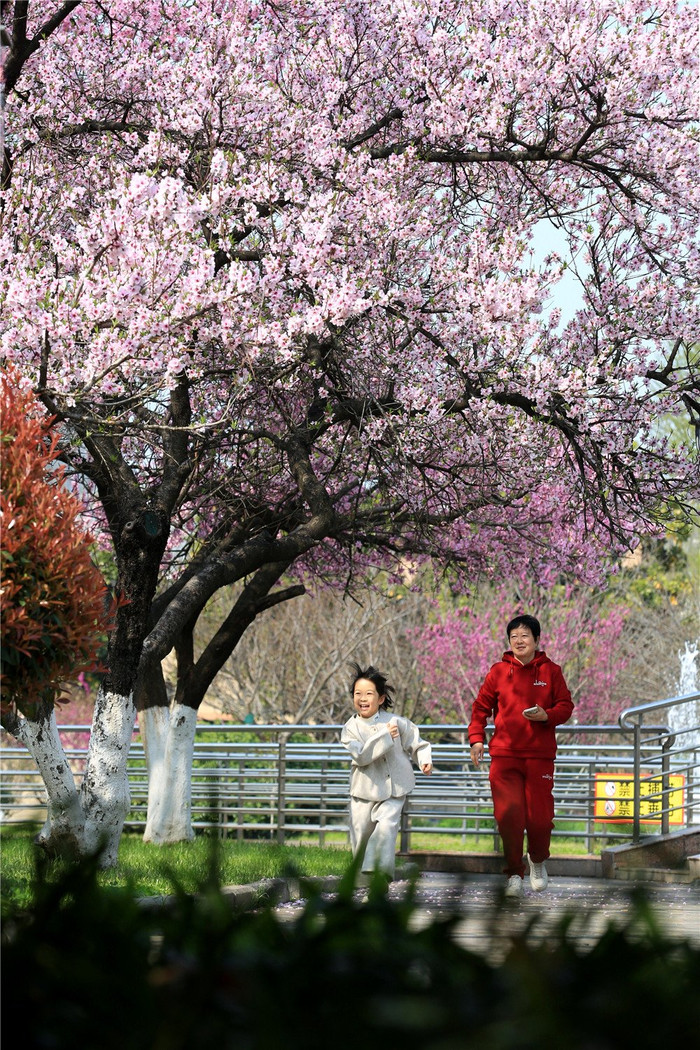 3月29日,沭阳县境内的沭河两岸柳绿花艳,知足清秀。东说念主们散步沭河两岸,犹如在画中穿行。