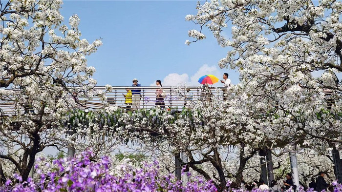 4月1日,宿迁三台山国度丛林公园内,春风拂过,万亩戏班短暂化作“堆雪铺玉”的“瑶池”。
