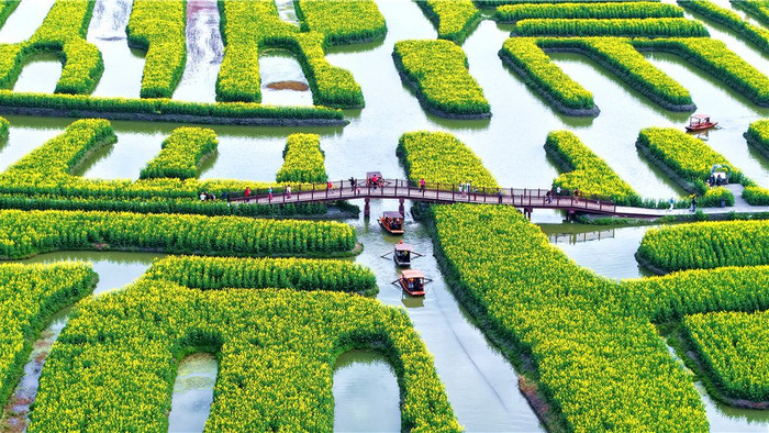 3月27日,kaiyunsports泰州市兴化千垛景区逾万亩油菜花怒放。统共这个词景区宛如一片漫恢弘缘的金黄花海,游东说念主穿行其间,船在花中游走,花、东说念主、船相互照映,抱成一团,一片春光明媚征象。