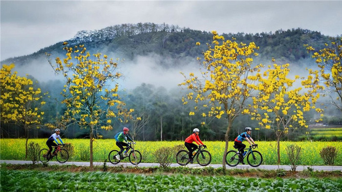 百花齐放时节,广东河源河角坪黄花风铃木竞相怒放,骑行兴趣者前来不雅赏。
