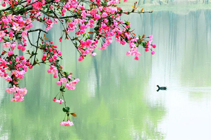 春风和睦,在泗阳城南植物园里,海棠垂枝,水鸟划波,尽揽明媚春光。