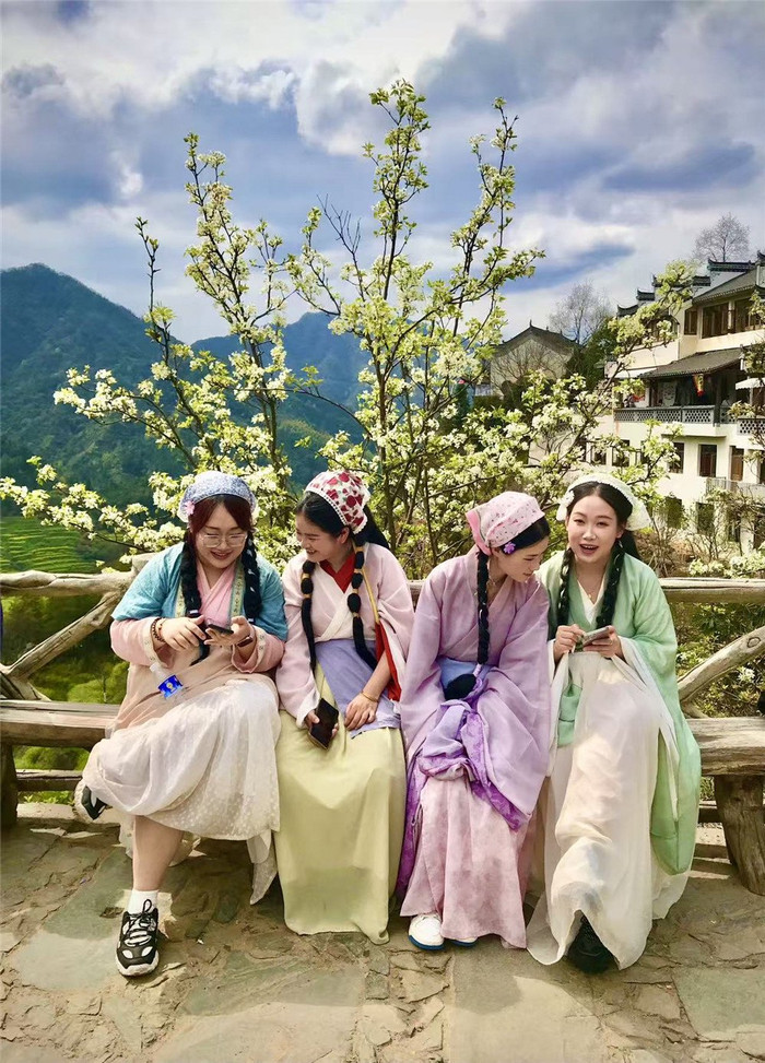 3月28日,梨花怒放在婺源篁岭古村。清纯盛大的青娥们身穿汉服谈古说今,共享相互趣事见闻。