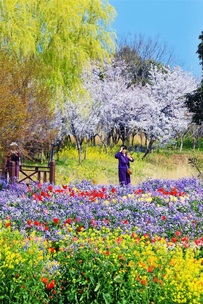三月芳菲始,花开正那时。在泗洪洪泽湖湿地景区里,一位旅客站在五彩纷呈的花海里,定格一统共这个词春天的任性。