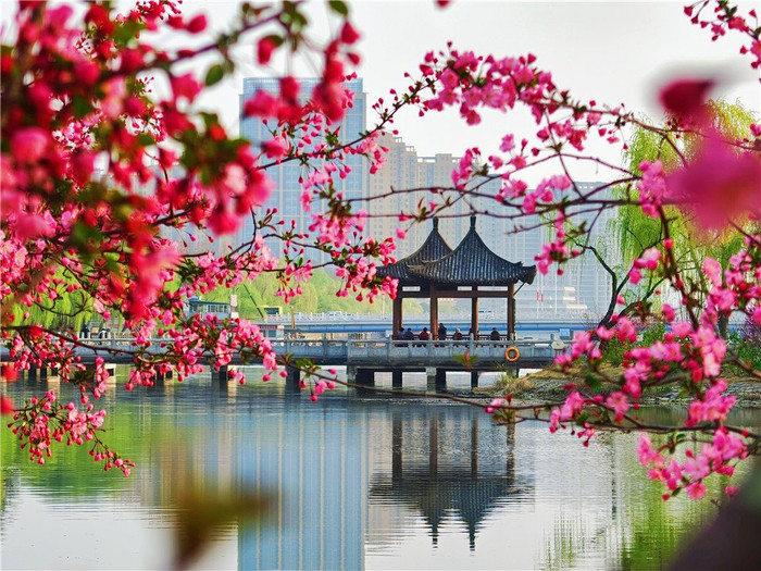 3月27日,春日的古黄河边,垂丝海棠强烈怒放,粉红花枝如帘幕般晕染出任性春意。