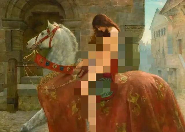 画中的梦魔标识着男性的守望骑在女子身上一副投降者的姿态。女子则是屈从,而马头探入红色帷幕,似乎在暗意性行动。
