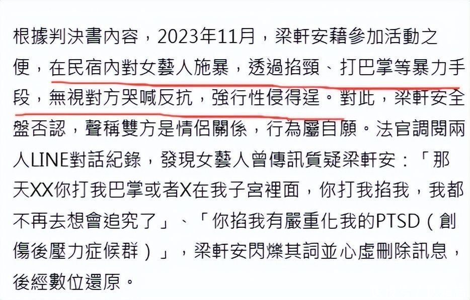 法院判决晓谕明确记录:2023年11月,梁轩安以参与行业调换行径为由,邀约别称女艺东说念主入住民宿,随后选拔掐颈、批颊等暴力技能,强行与其发素性关联并得逞。