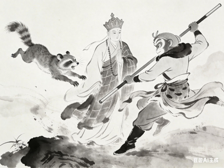 悟空眼疾手快,抄起金箍棒就打,可这狗尾续鼠精滑熘得很,一下子就钻进了洞里。