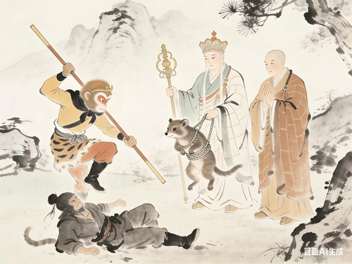 悟空收住金箍棒,猜疑地看着灵吉菩萨。